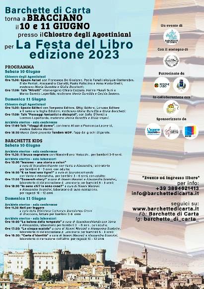 La manifestazione gode del patrocinio del Comune di Bracciano e della collaborazione della Biblioteca Comunale Bartolomea Orsini. Anche quest’anno saranno protagonisti gli autori e le case editrici indipendenti del nostro territorio, (ma non solo!) con i loro stand. La Festa del Libro sarà caratterizzata da numerosissimi eventi dedicati a bambini, ragazzi e adulti: laboratori ludico-didattici condotti dall’associazione Scarabocchiando, dalla Biblioteca Comunale Bartolomea Orsini e da Massimiliano Maiucchi, sapiente ed esperto saltimbanco capace di divertire i bambini in modo intelligente e lasciare a bocca aperta gli adulti! Talk e reading ci consentiranno di conoscere autori ed editori e considerare i vari generi letterari con occhi nuovi! Marco Danè ci farà conoscere la sua nuova App di giochi di parole coinvolgendoci in un divertentissimo torneo! La FISAR-Manziana sarà presente proponendoci l’assaggio di alcune delle eccellenze del vino locale! Difficile riassumere cosa sarà BARCHETTE DI CARTA – Festa del Libro, II Edizione a Bracciano, tra nuove proposte letterarie, laboratori e musica, per cui non resta che partecipare: il 10 e 11 giugno dalle 10:30 del mattino sino a sera, a Bracciano presso il Chiostro degli Agostiniani, in Via Umberto I, 5.