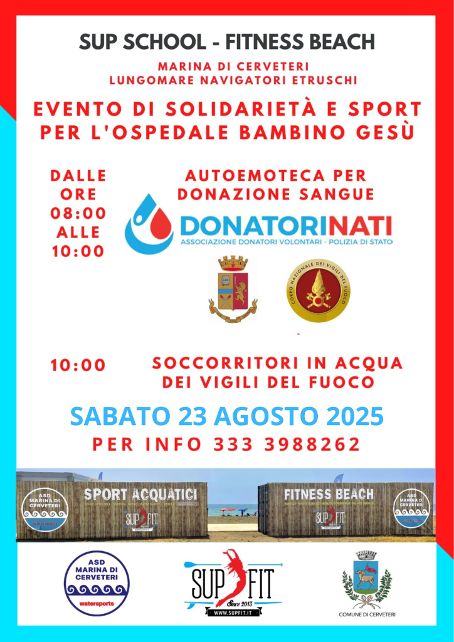 Solidarietà e sport protagonisti sul Lungomare dei Navigatori Etruschi a Campo di Mare. Una mattinata organizzata da Roberta Mariani, Presidente della Consulta dello Sport e dalla Sup School Fitness Beach con una causa davvero nobile: raccogliere sangue in favore dell’Ospedale Bambino Gesù di Palidoro e dei suoi piccoli pazienti. L’appuntamento è per sabato 23 agosto a partire dalle ore 08:00 del mattino.