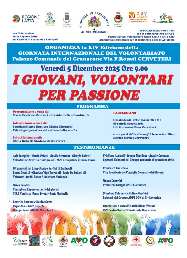 Anche quest’anno si celebra la Giornata internazionale del Volontariato con un convegno rivolto alle classi di scuola secondaria “I giovani volontari per passione”, organizzato Scuolambiente Roma nord in collaborazione con alcune realtà associative del territorio.Venerdì 5 dicembre ore 9:00 al Palazzo comunale del Granarone, infatti, giovani volontari di molte associazioni parleranno della loro esperienza , dando testimonianza del loro impegno di fronte ad altri giovani, gli studenti delle classi 5 del Liceo Scientifico Enrico Mattei e gli studenti delle classi 2° Be C della secondaria dell’ IC Giovanni Cena. Un convegno sostenuto dalla Regione Lazio, dai comuni di Cerveteri e Ladispoli, dal CSV Lazio ETS Centro servizi volontariato, dal Banco Alimentare Lazio e dalla Rete Diocesana Cura del Creato. “Abbiamo voluto che fossero i ragazzi a parlare ad altri ragazzi” Spiega la presidente di Scuolambiente Maria Beatrice Cantieri “perché sapranno trovare le parole e il messaggio giusto da condividere con il loro coetanei. Siamo inoltre contenti che questa iniziativa sia in collaborazione con le altre associazioni. Questa sinergia, questa capacità di unire le forze e condividere le diverse impostazioni è un punto di forza del nostro territorio dove l’Associazionismo è vivo e solidale” Così dopo i saluti istituzionali del Sindaco Gubetti, la presentazione di Maria Beatrice Cantieri e l’introduzione della dottoressa Giulia Gherardi, psicologa operativa nel settore scuola, la parola passerà ai giovani mentre le conclusioni saranno a cura di Massimiliano Venturi del Centro Servizi del Volontariato di Roma.