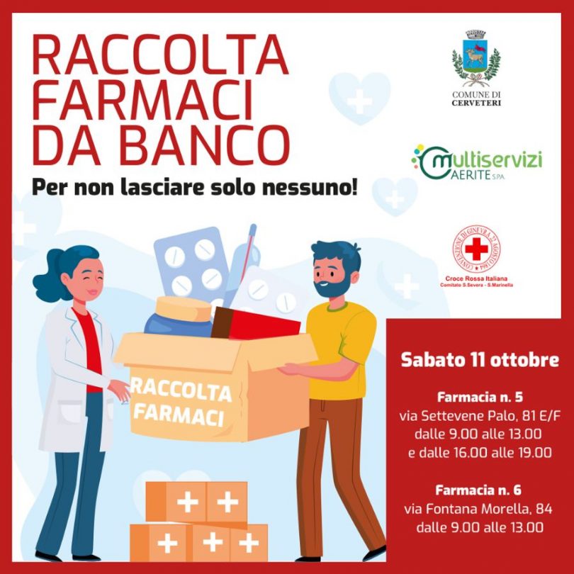 Una lunga giornata di solidarietà a Cerveteri sabato 11 ottobre. La Croce Rossa Italiana, comitato di Santa Severa-Santa Marinella, in collaborazione con il Comune di Cerveteri e la Multiservizi Caerite ha infatti organizzato presso le Farmacie comunali n.5 e n.6 una giornata di raccolta del farmaco da banco.