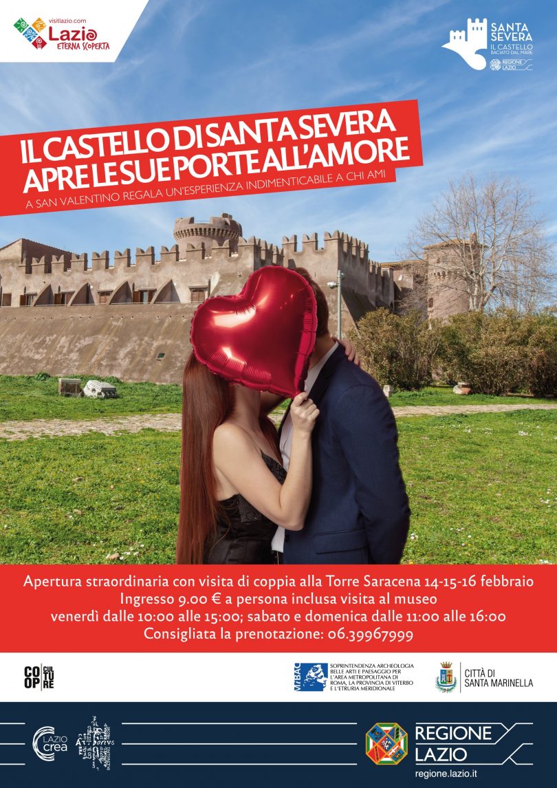 Si avvicina San Valentino, la festa che prende il nome dal santo protettore degli innamorati. Una ricorrenza che affonda le radici in epoca romana quando, nel 496 d.C., l’allora papa Gelasio I volle porre fine ai lupercalia, gli antichi riti pagani dedicati al dio della fertilità Luperco, anticipando di un giorno la festa. Da allora e fino ai nostri giorni il 14 febbraio è la ricorrenza più amata da tutti gli innamorati.E se volete un’idea per passare una festa degli innamorati diversa, il 14, 15 e 16 febbraio il Castello di Santa Severa, spazio della Regione Lazio gestito da LAZIOcrea, in collaborazione con il Comune di Santa Marinella e Coopculture, apre le sue porte all’amore per un’esperienza indimenticabile. Un’apertura straordinaria che permetterà alle coppie di salire sulla Torre Saracena, alla quale accedere attraverso il ponte che la unisce alla Rocca: un passaggio romantico a picco sul mare. L’antica fortificazione cilindrica, anticamente chiamata “La Torre del Castello”, edificata a metà del IX secolo per volere di papa Leone IV, a seguito di continui rifacimenti, è giunta a noi nella sua struttura ultima datata tra il XVI e il XVII secolo. Tutto intorno il complesso, circondato da un fossato, è caratterizzato dalla presenza di quattro torri angolari, due rettangolari e due cilindriche, e da un mastio, anch’esso cilindrico, collegato al complesso da una passerella in legno. Con i suoi 20 metri di altezza e una superficie interna di circa 800 mq da non perdere il Museo del Castello in cui sono conservati i più importanti reperti portati alla luce nell’area del cortile della Rocca provenienti dai recenti scavi svoltisi in concomitanza con i lavori di restauro e curati dalla Soprintendenza e dai volontari del Gruppo Archeologico del territorio Cerite. Il museo è arricchito da pannelli illustrativi, gigantografie, video-proiezioni e ricostruzioni 3D di ambienti, strumenti, armi e tecnologie antiche che raccontano la storia e la vita del castello, del suo borgo e della relativa tenuta, dall’epoca etrusca al martirio di Santa Severa, passando per l’età romana e medievale fino ad arrivare ai giorni nostri. Ingresso €9.00  a persona inclusa visita al museo venerdì dalle 10:00 alle 15:00; sabato e domenica dalle 11:00 alle 16:00. Consigliata la prenotazione: 06.39967999