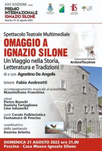 In occasione del Premio, l’attore-regista Agostino De Angelis, porterà in scena un suo inedito adattamento teatrale dedicato a Silone, il 21 agosto alle ore 21c/o la Casa Museo a Pescina, organizzato dall’Associazione ArcheoTheatron ad ingresso libero.