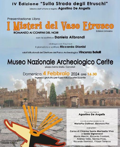 L’Appuntamento si inserisce anche nell’ambito della #domenicalmuseo, iniziativa del Ministero della Cultura che consente l’ingresso gratuito, ogni prima domenica del mese, nei musei e nei parchi archeologici statali. Il progetto “Sulla Strada degli Etruschi” è strutturato e ideato da De Angelis come un contenitore culturale, in cui saranno realizzate diverse attività artistiche e culturali riguardanti oltre che il tema sugli Etruschi, da cui prende il nome, anche attività di natura diversa, sempre puntando lo sguardo sulla valorizzazione del nostro Patrimonio culturale. Ed è in questo contenitore, che domenica sarà presentato come apertura della stagione letteraria 2024, il libro “I Misteri del Vaso Etrusco” della pluripremiata scrittrice Daniela Alibrandi, che vanta una vasta produzione letteraria apprezzata in Italia e all’Estero. Dopo l’introduzione e i saluti del direttore del Parco Archeologico Cerveteri Tarquinia Vincenzo Bellelli, dialogherà con l’autrice lo scrittore e giornalista Riccardo Dionisi alla scoperta della peculiare società di provincia. La trama, infatti, è ambientata in un borgo antico ricco di reperti archeologici dell’epoca etrusca, dove nonna Adele e i suoi nipoti, Mirko e Rosy, ai quali ha fatto anche da madre, si trovano a combattere contro un destino che non dà tregua. Il forte legame con la terra d’origine, il peso della crisi economica e la crudeltà di un male sconosciuto che ha colpito la nipote portano nonna Adele a vendere la cosa più preziosa che possiede e che crede risolleverà le sorti della famiglia. L’autrice dipinge una vicenda semplice e profonda che porta a riscoprire il valore del nucleo familiare, nido che può proteggere dalle più aspre dinamiche paesane. Daniela Alibrandi consegna al lettore la storia di tre vite ordinarie che diventano straordinarie, indagando nei cassetti più riposti della mente umana. La presentazione sarà arricchita da momenti recitati di Agostino De Angelis con la partecipazione di MariaPia Gallinari, Eleonora Pini e gli allievi del corso di Cinema Santa Marinella Viva di Sonia Signoracci: Monia Marchi, Riccardo Frontoni, Andrea Vella, Nerina Piras, Riccardo Dominici, Filippo Soracco. L’iniziativa è patrocinata anche da: Rivista Archeologia Viva, Firenze ArcheoFilm Festival, tourismA.