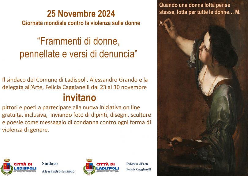 “L’amministrazione comunale di Ladispoli chiama a raccolta penne, matite e pennelli di poeti, pittori ed artisti creativi in occasione della Giornata internazionale contro la violenza sulle donne”.