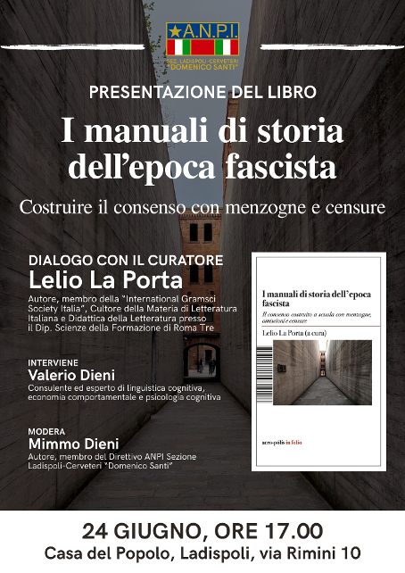 Martedì 24 giugno alle ore 17,00, presso la Casa del Popolo di Ladispoli in Via Rimini 10, presenterà il suo libro “Manuali di Storia dell’epoca fascista. Il consenso costruito a scuola con menzogne, omissioni, censure”, edito da Acro-Pòlis, mentre Valerio Dieni, consulente ed esperto di linguistica cognitiva, economia comportamentale e psicologia cognitiva interverrà sui meccanismi di creazione del consenso nei regimi dittatoriali.