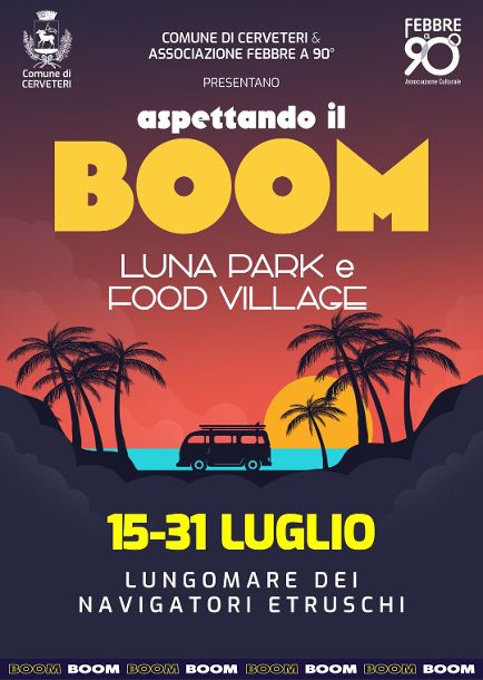 Sabato 23 e domenica 24 luglio il Lungomare dei Navigatori Etruschi a Campo di Mare (Cerveteri) ospiterà il Jova Beach Party 2, unica tappa in tutto il Lazio del tour estivo di Lorenzo Jovanotti che dopo il concerto del 2019 torna sulla spiaggia degli Etruschi con due date straordinarie. Nei giorni che precedono il doppio concerto e in quelli successivi, il Comune di Cerveteri insieme all’Associazione Febbre a 90°, proprio sul Lungomare dei Navigatori Etruschi ha organizzato “Aspettando il BOOM”, un maxi villaggio che tra intrattenimento, aree food e un luna park fatto di giochi e giostre scandirà le ore e i giorni che separano la città dal ritorno del più grande evento dell’estate. L’appuntamento con “Aspettando il Boom” è da venerdì 15 a domenica 31 luglio, tutti i giorni, dalle ore 18:00 fino a tarda sera.