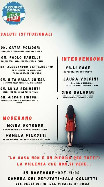 “Il nostro tour – dichiara Pamela Pierotti Responsabile Azzurro Donna della Provincia di Roma – è iniziato venerdì 14 novembre nella splendida cornice delle Scuderie Estensi di Tivoli, dove la responsabile cittadina Giuliana Mosca ha organizzato un evento “Libera di essere: basta violenza” che ha registrato la presenza di moltissime persone tra i quali vari rappresentati istituzionali: Segretario provinciale On. Alessandro Battilocchio e i consiglieri regionali Giorgio Simeoni, Fabio Capolei e Roberta Della Casa. Proseguiremo il 25 novembre alla Sala Colletti con convegno “La casa non é un rifugio per tutti: la violenza che non si vede” che vedrà la partecipazione , tra gli altri delle segretaria nazionale Azzurro Donna Catia Polidori, del Capogruppo alla Camera Paolo Barelli, dell’On Alessandro Battilocchio, della deputata Rita Dalla Chiesa, del Segretario romano Luisa Regimenti e del Capogruppo in Regione Giorgio Simeoni. Concluderemo il 28 novembre ore 17 a Guidonia con le amiche di Azzurro Donna capitanate da Maria Cristina Luciano “Nel cuore delle donne” e’ il titolo scelto per l’evento ed anche quella sarà un momento di discussione, sensibilizzazione e riflessione perché noi non gireremo mai la faccia dall’altra parte.”