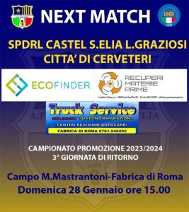 Sfida salvezza decisiva per entrambe, soprattutto per i padroni di casa, ultimi in classifica con appena sei punti, aggrappati ad una fioca fiammella per sperare ancora nella salvezza attraverso gli spareggi. La partita si giocherà sul sintetico di Fabrica di Roma il 28 gennaio alle ore 15.00, un trasferimento necessario in attesa della sistemazione del manto erboso del campo Darida che non è praticabile per un campionato come quello di Promozione. A Castel Sant’Elia intanto la società sta chiamando a raccolta i tifosi, per i gialloblu è davvero l’ultima spiaggia, un’altra sconfitta spalancherebbe in modo definitivo per porte del baratro. Anche a Cerveteri cresce l’attesa per la sfida, saranno tanti i tifosi che domenica pomeriggio si faranno una passeggiata a Fabrica di Roma sperando in un’altra vittoria dei verdeazzurri.