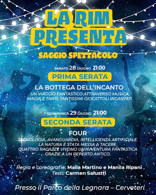 Sabato 28 e domenica 29 giugno, presso il Parco della Legnara di Cerveteri, si terranno i saggi spettacolo della RM Sport Cerveteri. Saranno 2 show di danza che spazieranno dal modern all’hip-hop, passando per il latin. Le serate saranno caratterizzate da racconti diversi e originali con la direzione artistica di Maila Martino e Manila Ripani, arricchita dai testi scritti da Carmen Salustri.