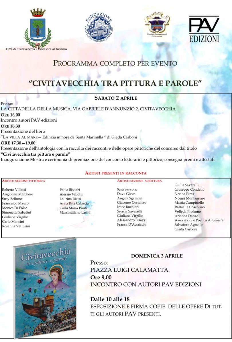 “Un progetto culturale editoriale inserito nei festeggiamenti Santa Fermina 2022, articolato alla diffusione del valore del libro cartaceo e alla  valorizzazione della cultura del territorio attraverso la selezione di 35 artisti tra scrittori poeti e pittori emergenti e non per raccontare Civitavecchia. Tanti i lavori pervenuti anche da altre città e questo non può altro che renderci soddisfatti per aver fatto viaggiare la nostra città oltre confine. Nell’iniziativa oltre alla realizzazione dell’antologia è inserita una mostra pittorica dei lavori pubblicati nel libro che durerà fino al 9 di aprile presso il foyer della Sala Molinari con i seguenti orari: domenica: 16.30/19.00 .Lun. al venerdì: 10.00/12.00 – 16.30/19.00 ­- sabato 9 aprile 16.30/19.00. A chiusura dell’iniziativa domenica 3 aprile “Incontro con gli autori PAV” dalle 10.00 alle 18.00 presso piazza Calamatta.” afferma Ombretta Del Monte che ringrazia la responsabile editoriale Aurora Di Giuseppe da sempre sensibile alla crescita culturale e sociale: “La finalità di un concorso è far conoscere i lavori artistici dei partecipanti; e dunque, con questa raccolta, vi doniamo gli scritti e gli elaborati degli autori selezionati. In queste pagine troverete colori, emozioni, incanti, entusiasmi, amore e ricordi. Perché un artista è tale se sa, con i modi e gli strumenti che più gli sono consoni, riportare su una tela o su un foglio quello che di più bello vede o pensa. La PAV edizioni è solita donare una percentuale dei proventi, tolte le spese di gestione, ad alcune associazioni. Il ricavato di questa antologia, visti i tempi che stiamo vivendo, sarà devoluto, con la gioia e l’entusiasmo che 8 sempre caratterizza le nostre iniziative, alla Croce Rossa Italiana”