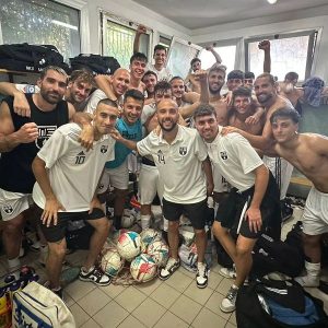 La festa negli spogliatoi di Pomezia dei giocatori della W3 Maccarese