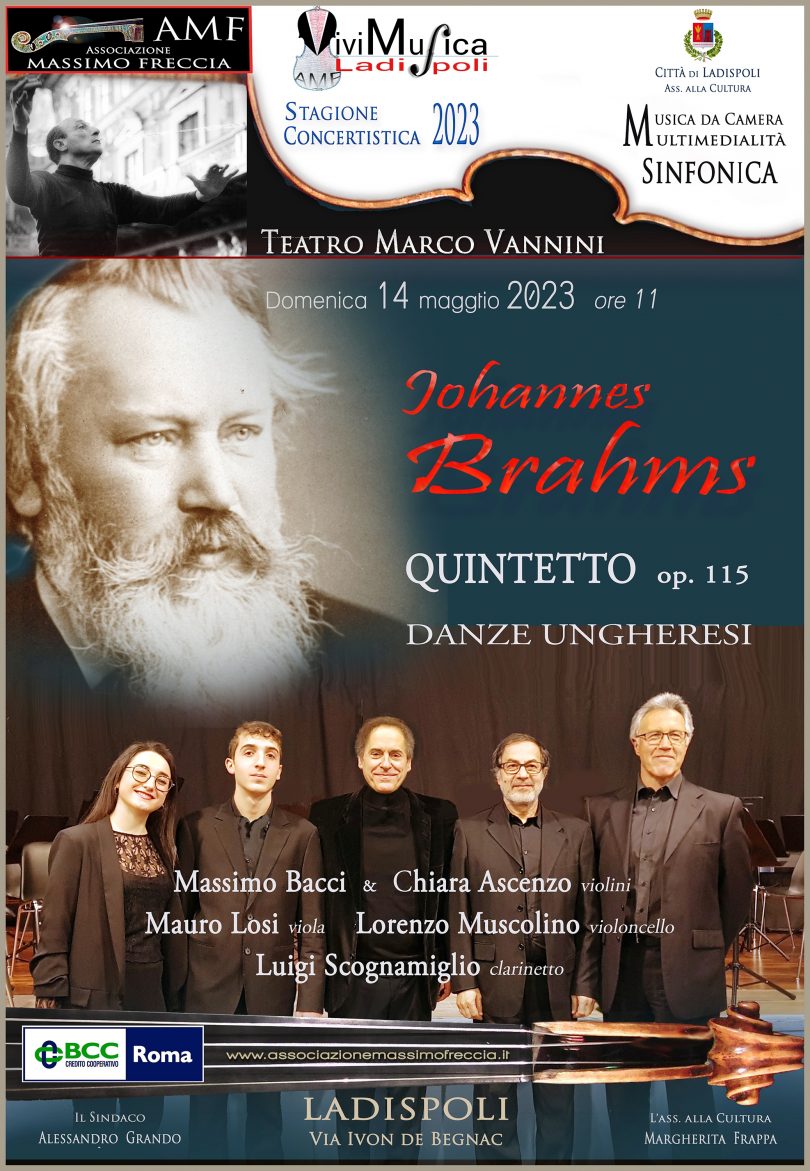 Alle ore 11 di domenica 14 maggio 2023, al Teatro Marco Vannini di Ladispoli, quarto appuntamento della Stagione “VIVIVMusica 2023” realizzato dall’Associazione Massimo Freccia in collaborazione con l’Assessorato alla Cultura della Città di Ladispoli. In programma il Quintetto in Si minore op. 115 e le Danze Ungheresi di Johannes Brahms.