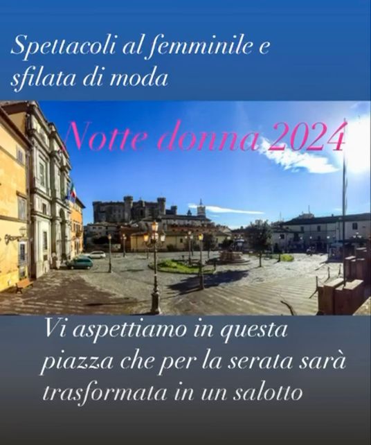In Piazza IV Novembre, è cambiata la location, vi saranno una serie di iniziative legate all’universo femminile, dalla moda a dibattiti sulla donna all’interno del tessuto sociale.  Con l Associazione Commercianti di Bracciano e il comune lacustre, è stato realizzato un palinsesto di iniziative che partirà dalle 18.00 per finire a tarda notte. ” Novità di questa edizione di notte donna 2024 sarà il salotto a cielo aperto realizzato in piazza del comune dove sarà allestito un palco di oltre 12 metri che ospiterà eventi culturali, musical , sfilata di moda , balletti tutti dedicati alla donna. Seguirà musical Carrashow che coinvolgerà il pubblico presente . Oltre ai posti a sedere gratuiti ci sarà la possibilità di scelta tra numerose offerte culinarie , sia cena sia apericena , cocktail aperitivo e quant’ altro”.