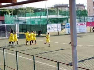 La gioia dei giocatori della W3 Maccarese dopo la rete di Fe nel match di andata