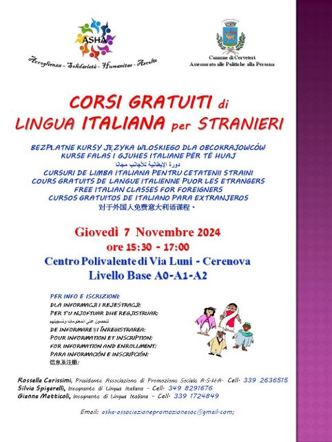 Prenderanno il via giovedì 7 novembre alle ore 15:30 presso il Centro Polivalente di Via Luni a Cerenova i corsi gratuiti di lingua italiana per stranieri. I corsi, un appuntamento che si ripete oramai da tanti anni a Cerveteri, sono organizzati dalla “Aps ASHA – Accoglienza, Solidarietà, Humanitas e Ascolto” e patrocinati dall’Amministrazione comunale di Cerveteri.