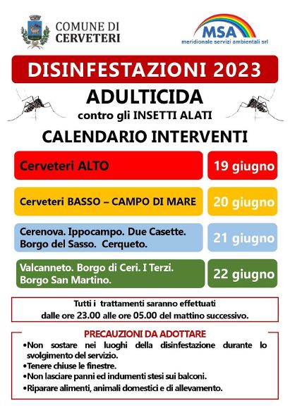 Il calendario degli interventi inizierà lunedì 19 giugno Cerveteri capoluogo alto, martedì 20 giugno Cerveteri capoluogo basso e Campo di Mare, mercoledì 21 giugno Cerenova, zona Ippocampo, Due Casette, Sasso e Cerqueto, giovedì 22 giugno Valcanneto, Ceri, Borgo San Martino e I Terzi. I trattamenti avranno inizio alle ore 23:00 e si concluderanno alle ore 05:00 del mattino seguente.