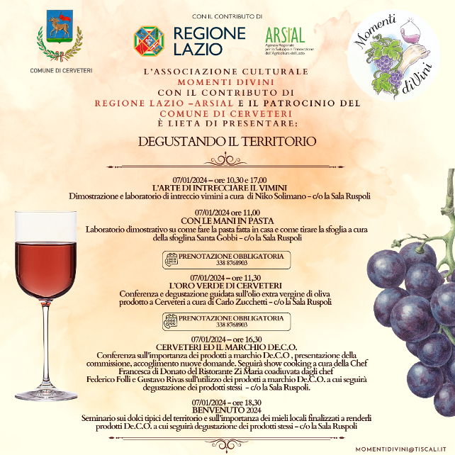 L’Associazione Culturale MOMENTI DIVINI con il contributo di Regione Lazio – Arsial e con il patrocinio del Comune di Cerveteri,  è lieta di presentare una serie di incontri e degustazioni guidate, seminari, laboratori, show coking, momenti conviviali al fine di valorizzare e promuovere le produzioni vitivinicole del territorio cerite, i prodotti dell’agrifood locale e del patrimonio paesaggistico e culturale, i prodotti a marchio De.C.O.