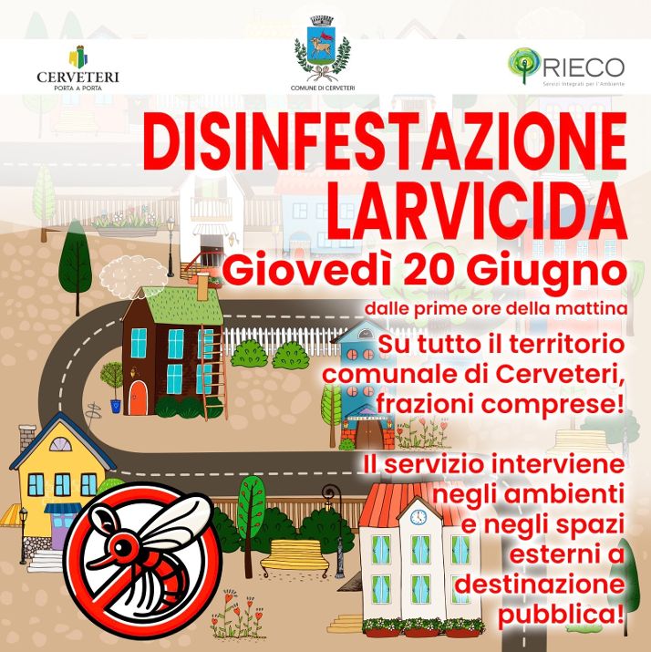 L’Amministrazione comunale di Cerveteri rende noto che dalle prime ore di questa mattina, giovedì 20 giugno, insieme alla Rieco Spa, azienda titolare dell’appalto di igiene urbana della città, si sta procedendo ad una disinfestazione larvicida nell’intero territorio comunale di Cerveteri, dal Capoluogo a tutte le Frazione.