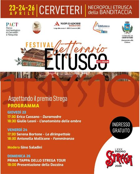 ìLa grande letteratura torna protagonista nel cuore della storia. In occasione del fine settimana della Festa della Liberazione, la Necropoli Etrusca della Banditaccia, sito UNESCO di Cerveteri, ospiterà l’edizione 2026 del Festival Letterario Etrusco, seguita dall’attesa tappa nazionale del Premio Strega.