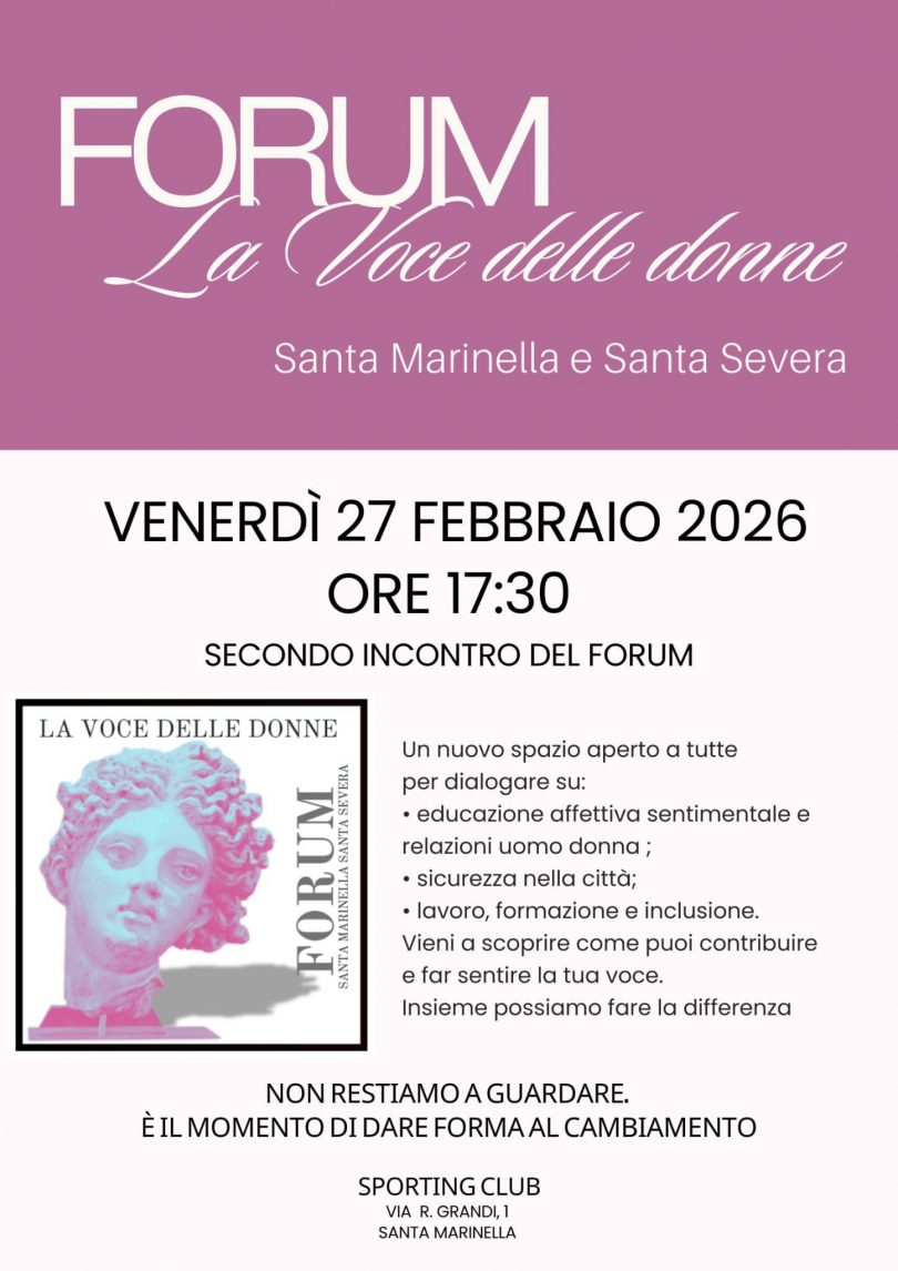 Sarà il 27 febbraio alle ore 17, 30, presso lo Sporting Club di Santa Marinella il secondo incontro del Forum delle Donne di Santa Marinella e Santa Severa. “Nel corso del primo incontro sono emerse tante idee, tante emozioni e voglia di partecipare” spiegano le organizzatrici “è stato molto interessante questo momento assembleare per raccogliere le proposte di tutte, ma ora è necessario cominciare ad essere operative” Così il secondo incontro sarà più pragmatico e vedrà la formazione di gruppi di lavoro ai quali ognuna liberamente potrà dare il suo contributo in base ai suoi interessi e alle sue competenze. Le organizzatrici hanno sintetizzato in tre punti le proposte emerse che si sono articolate intorno a tre argomenti. Prima di tutto l’educazione affettiva sentimentale e le relazioni uomo donna. La violenza e i femminicidi sono infatti solo la punta dell’iceberg di una mentalità patriarcale ancora diffusa, secondo quanto emerso dal dibattito, anche a Santa Marinella. Il secondo punto da analizzare è la sicurezza in città. Soprattutto le più giovani hanno manifestato il timore di passare in certe vie che sono scarsamente illuminate o comunque transitabili con difficoltà. l terzo focus è il tema del lavoro e dell’inclusione sociale. L’emancipazione economica è infatti il primo passo per l’emancipazione sociale. Quindi temi molto concreti che potrebbero portare un contributo significativo alla crescita della città