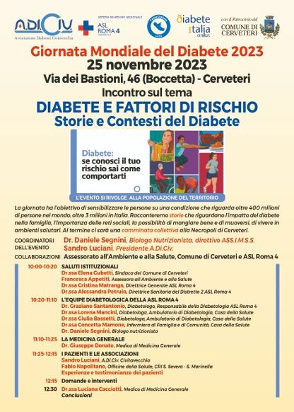 “Diabete e fattori a rischio – Storie e contesti del diabete”, è questo il titolo dell’incontro pubblico che si svolgerà sabato 25 Novembre a partire dalle ore 10:00 presso il Centro Anziani in Via dei Bastioni n.46, nel Centro Storico di Cerveteri. Un appuntamento promosso dall’Assessorato alla Salute del Comune di Cerveteri, Associazione Diabetici Civitavecchia, la Asl Roma 4 e Diabete Italia Onlus, promosso in occasione della Giornata Mondiale del Diabete 2023.