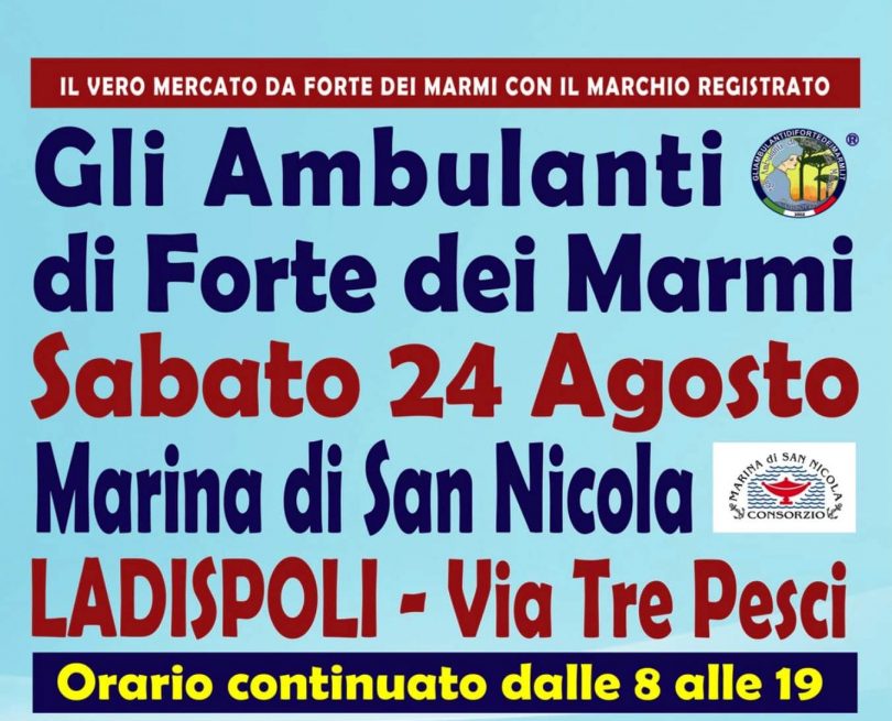 Gli Ambulanti di Forte dei Marmi: le bancarelle del mercato di qualità più famoso d’Italia tornano per la chiusura d’estate a gran richiesta sul litorale romano con tutto il meglio del Made in Italy artigianale e le ultime tendenze della moda. Si potranno infatti ammirare le ormai mitiche “boutique a cielo aperto” dell’originale Consorzio sabato 24 agosto alla MARINA DI SAN NICOLA, Ladispoli, in Via Tre Pesci, e domenica 25 agosto a SANTA MARINELLA, nella tradizionale location del Lungomare G. Marconi. Dunque, due appuntamenti per guardare alle prossime collezioni moda e che saranno come sempre all’insegna dello shopping più glamour e conveniente, con orario continuato, anche in caso di maltempodalle 8 alle 19.