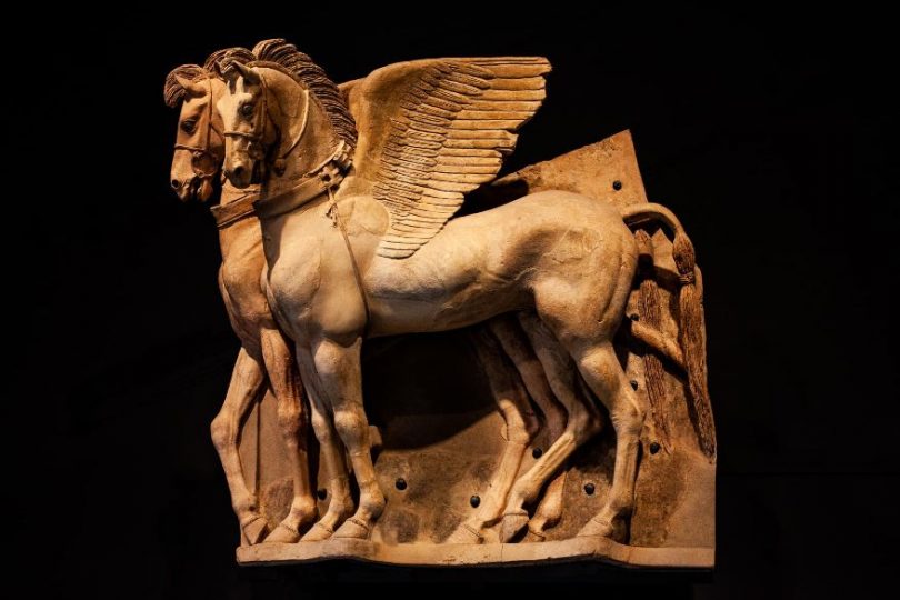 Palazzo Vitelleschi a Tarquinia, costruito all’inizio del 1400 p. C., è considerato uno dei più belli ed interessanti palazzi rinascimentali del Lazio ed è più che giusto che esso ospiti, fin dal 1924, il pregevolissimo Museo Archeologico Nazionale di Tarquinia. Il palazzo/museo è sito all’ingresso dell’attuale Tarquinia la quale è il prosieguo urbanistico della Corneto di storica memoria medioevale mentre la Tarquinia etrusca è altrove, (ma di questo parleremo più avanti) possiede all’interno dei suoi splendidi e ben curati ambienti (da alcuni dei quali si ammira pure tutta la costa) anche due magnifici capolavori in assoluto, uno i Cavalli Alati (stupendo altorilievo fittile) appartenenti al più rifulgente periodo etrusco, il IV secolo a.C., provenienti dall’Ara della Regina da Pian di Civita ove c’era l’antico insediamento etrusco di Tarchna (siamo ad est sull’Aurelia bis prima di Monte Romano, sulla sinistra andando verso tale piccolo delizioso paese lasciandosi alle spalle i bei resti del notevolissimo acquedotto antico romano). L’altro capolavoro è il Mitra Tauroctono (Mitra che uccide il toro) il gruppo marmoreo recuperato dallo speciale Nucleo Tutela del Patrimonio Culturale dell’Arma dei Carabinieri nell’ambito di una operazione di contrasto all’esportazione clandestina. Si tratta di una splendida realtà realizzata in un bellissimo candido marmo greco (di Paros nelle Cicladi?), ove c’era la marmistica più pregevole delle isole egee, proveniente da scavi clandestini effettuati nella zona di Tarquinia. Mitra Tauroctono risalente al “secolo d’oro” (l’apogeo imperiale) dell’antica Roma che fu quello del periodo (siamo intorno al 150 p. C.) in cui regnò anche l’imperatore Antonino Pio ( il Mitra, per una tutta serie di realtà realizzative, è ascrivibile proprio alla sua epoca). Il Mitra Tauroctono è stato riportato a Tarquinia perché, dalle ricerche effettuate, si è potuto verificare con certezza che proveniva da un mitreo privato appartenente ad una domus dell’area tarquiniese in quanto in quel luogo, all’interno del parco archeologico, si è ritrovato un frammento del cane, scolpito nella scultura, perfettamente combaciante con il resto dell’opera. Il suddetto gruppo marmoreo, sicuramente realizzato da un importante e capacissimo artista, rappresenta, secondo l’iconografia dell’epoca, il dio Mitra che pugnala a morte il toro ai cui fiotti di sangue sgorganti dalle ferite si abbeverano un cane ed un serpente mentre un grosso scorpione con le sue chele stringe i testicoli taurini. Il culto, molto misterico, del dio Mitra ha profonde ed antiche origini religiose (oltre mille anni prima della nascita di Cristo) soprattutto nella zona indica e nell’antica Persia, da cui poi trasmigrò in Grecia e di là nell’Impero romano subendone alcune modifiche “liturgiche” più consone ai più che vasti dominions di Roma. I Cavalli alati, che sono semplicemente meravigliosi e sicuramente realizzati da un artista etrusco ( o greco?) di primissimo piano cosa questa che Tarquinia, città potentissima e molto ricca, la quale dette anche ben tre re (Servio Tullio, Tarquinio Prisco, Tarquinio il Superbo) alla “Città Eterna – vds. Tibullo”, dei sette che regnarono nell’antica Roma lasciano semplicemente basiti gli spettatori per la raffinatezza dell’opera curata fin nei più piccoli dettagli ad es.: La magnifica postura, l’inserzione delle ali nei due corpi equini, la muscolatura, gli splendidi musi, l’annodamento delle code e tanti altri mirabili aspetti che si scoprono man mano ammirandoli dal basso per cui viene naturale pensare e magari dire anche: “Che stupenda meraviglia”. Il bello, anzi il bellissimo del tutto, è che il Mitra è stato posto, in maniera estremamente intelligente, a fare da prologo, in una sala estremamente contigua che li precede, agli eccezionali Cavalli Alati (siamo nell’ambito del cosiddetto Salone delle Armi che è al secondo piano del museo il quale di piani sopraelevati ne conta tre) per cui, per il visitatore, è un crescendo di grande meravigliosa bellezza, alla quale si giunge salendo dal piano inferiore, attraverso una interessantissima scala, di questa splendida realtà museale che merita assolutamente una approfondita e quanto mai dettagliata visita che comprende anche il vedere, in completum, tutte le pareti originali di una bellissima, tutta dipinta, tomba etrusca (la Tomba del Triclinio) ritrovata nel 1830 in località Calvario (siamo nel Sito UNESCO Patrimonio Mondiale dell’Umanità della Necropoli dei Monterozzi), tomba stupenda, dalle interessantissime pitture murarie, che George Dennis, etruscologo britannico, definì “la tomba della gioia e delle feste” e scusate se è poco. Dimenticavo di dire, per quanto concerne i meravigliosi Cavalli Alati che, quasi certamente, in origine fossero aggiogati ad un carro (probabilmente da parata vista la bellezza dell’opera) andato, purtroppo perduto, considerando il fatto che, nell’altorilievo, a ben guardare, si intravede l’incipit di una stanga di collegamento.