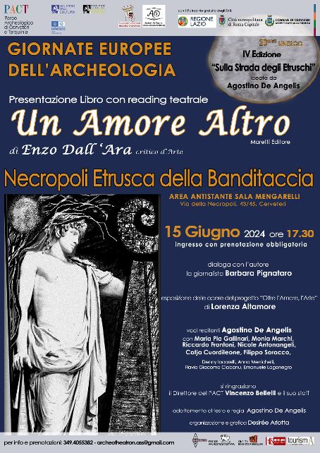 Sabato 15 Giugno 2024 alle ore 17.30 all’interno dell’area recintata della Necropoli Etrusca della Banditaccia di Cerveteri, nello spazio antistante la Sala Mengarelli, sarà presentato dall’associazione culturale ArchéoTheatron, il libro “Un Amore Altro” del professore Enzo Dall’Ara, critico d’Arte.