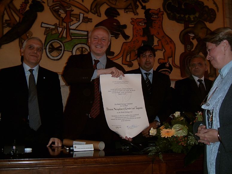 Non dimentichi della fondamentale importanza di possedere, in particolare nella Necropoli della Banditaccia a Cerveteri ed in quella dei Monterozzi a Tarquinia (e non solo visto che la menzione dell’UNESCO cita in generale le necropoli delle due città etrusche e non entra nei dettagli dei nomi), un invidiatissimo e molto peculiare Sito UNESCO Patrimonio Mondiale dell’Umanità si desidera elencare quanto correlato e correlabile in questo senso a ciò che ormai è da considerare, a tutti gli effetti, come parte integrante della storia moderna delle due città intessuta inscindibilmente con quella antica dei Rasenna ( gli Etruschi – ndr) . Per chi scrive aver partecipato e seguito moltissimo ed in prima persona e non certo da spettatore, tutto l’iter, Piano di Gestione incluso, per l’ottenimento per Cerveteri del Sito UNESCO è stato un impegno vuoi di alta professionalità che di più che importante arricchimento culturale ed umano vissuto in modo estremamente sinergico con altre Persone, molte extra moenia, di grande spessore e qualità; una di quelle cose che, se capitano, capitano rarissimamente di “incontrarle” nella propria vita. Un qualcosa che si ricorda sempre con il massimo piacere e che si ricorda sempre come un grande onore venuto in sorte. In proposito, considerata anche la riattualizzazione del tema visto che l’anno scorso furono doppiati i 20 anni dall’investitura e quest’anno sono 21 gli anni, si ritiene utile riportare a seguire, in stretto ordine cronologico, gli accadimenti che, “in una splendida galoppata” hanno portato al raggiungimento di quello che è un indubbio ambitissimo riconoscimento di assoluto prestigio e rilevanza mondiale. Ecco la cronologia: Settembre 2002 nota informativa del MIBAC ai Comuni di Cerveteri e Tarquinia, alla Soprintendenza per i Beni Archeologici dell’Etruria Meridionale, alla Provincia di Roma, alla Provincia di Viterbo e alla Regione Lazio nella quale si ipotizza la candidatura dell’Italia all’Unesco dell’anno 2003, ai fini dell’inserimento nella Lista del Patrimonio Mondiale dell’Umanità, dell’Unicum Etrusco rappresentato dalla necropoli etrusche di Cerveteri e di Tarquinia. 12 Dicembre 2002 Conferenza di servizi indetta dal MIBAC in ordine alla candidatura del Sito”Necropoli Etrusche di Cerveteri e Tarquinia” nella Lista del Patrimonio Mondiale dell’UNESCO. 14 Gennaio 2003 istituzione dello speciale ufficio di staff del comune di Cerveteri per la Candidatura del Sito Unesco della Necropoli Monumentale della Banditaccia. 22 Gennaio 2003 delibera, da parte del Comune di Cerveteri, avente per oggetto: “Approvazione del documento d’intesa tra il Ministero Beni Culturali, Regione Lazio, Provincie di Roma e di Viterbo, Comuni di Cerveteri e Tarquinia per la candidatura ai fini dell’inserimento nella lista del Patrimonio Mondiale Unesco delle Necropoli di Cerveteri e Tarquinia – Autorizzazione alla stipula del documento d’intesa del Rappresentante del Comune di Cerveteri”. 4 Febbraio 2003 firma, presso il MIBAC,del Protocollo d’Intesa per il Sito Unesco fra Stato, Regione, Province di Roma e Viterbo e Comuni di Cerveteri e Tarquinia. 15 maggio 2003 conclusione del “Concorso Internazionale per Idee per la Realizzazione del Parco Archeologico Cerite” indetto sulla base della legge della Regione Lazio n. 26 del 1999; il progetto vincitore verrà successivamente iscritto nel Piano di Gestione del Sito Unesco. 23 Luglio 2003 prima ispezione dell’Unesco da parte del suo ispettore prof. Giora Solar tesoriere generale dell’I.C.O.M.O.S. (International Council on Monuments and Sites – che è il braccio operativo dell’UNESCO- ndr) che visita prima il museo ed ivi controlla sia i vari progetti concernenti le ristrutturazioni di Case Grifoni,della Legnara e del Granarone che i tre progetti del Concorso Internazionale per Idee del Parco Archeologico Cerite risultanti ai primi tre posti; poi prosegue la visita alla Necropoli Monumentale della Banditaccia, alle “Tombe del Comune”, ai Grandi Tumuli, per concludere la giornata alla Rocca di Ceri. 18 Marzo 2004 seconda ispezione dell’ispettore Unesco prof. Solar che ricontrolla tutta la Necropoli della Banditaccia con particolare riferimento,in questo caso, alla Via degli Inferi, a seguire verifica i lavori, già in corso, presso le Case Grifoni, la Legnara ed il Granarone; nell’occasione tiene anche uno stage, presso la sala conferenze della biblioteca comunale, sulla gestione dei Siti UNESCO; prima di ripartire riceve tutta l’ampia documentazione fotografica (300 foto) trasferita su CD (realizzata tutta dal sottoscritto) delle sue due ispezioni (18 marzo incluso) e dei luoghi ispezionati cosa che gli fa estremamente piacere e che dice gli tornerà molto utile e la recherà con Lui a Parigi ( alla sede dell’UNESCO – ndr). Il 2 Luglio 2004 il Comitato Esecutivo dell’U.N.E.S.C.O. (United Nations Educational Scientific Cultural Organization) riunito a Suzhou (Città Sito UNESCO posizionata sul Fiume Azzurro in Cina e già visitata in passato da Marco Polo – una sorta di “Venezia fluviale” – ndr, proclama le Necropoli di Cerveteri di Tarquinia Sito Unesco Patrimonio Mondiale dell’Umanità con la seguente menzione: “Le Necropoli di Cerveteri e Tarquinia rappresentano un capolavoro del genio creativo dell’uomo: l’estensione delle pitture decorative di Tarquinia è eccezionale sia per le forme che per i contenuti poiché rivelano gli aspetti della vita, della morte e delle credenze religiose degli antichi Etruschi. Cerveteri presenta, nel contesto funerario, le stesse concezioni urbanistiche e architettoniche di una città antica. le due Necropoli costituiscono una testimonianza unica ed eccezionale dell’antica civiltà etrusca, unica tipologia di civilizzazione urbana dell’Italia pre-romana. La descrizione della vita quotidiana, rappresentata sugli affreschi delle tombe, molti dei quali presenti nelle abitazioni 