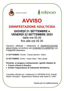 L’Amministrazione comunale informa che il 21 e 22 settembre si terrà un intervento di disinfestazione adulticida dalle zanzare nel territorio di Ladispoli.