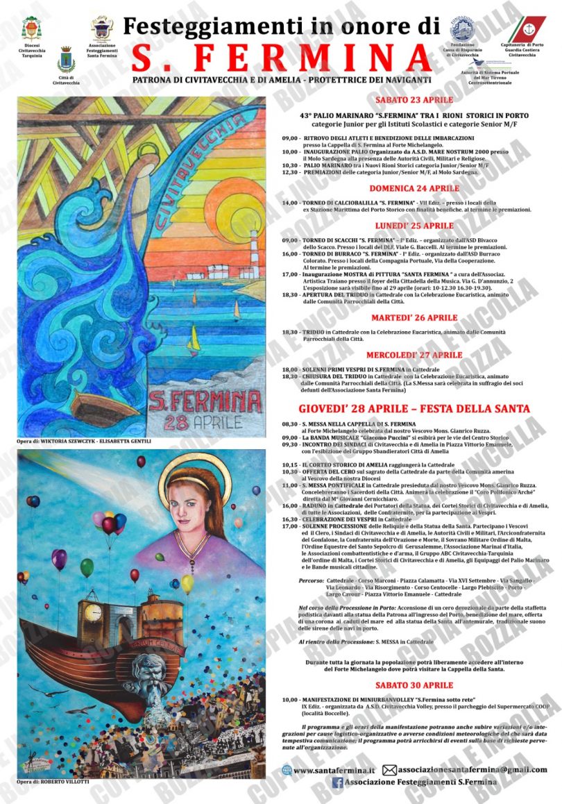 Finalmente il 28 aprile ritorna la Festa della Santa Patrona Fermina con la presenza dei Cortei Storici di Amelia e di Civitavecchia e degli Sbandieratori.Il programma non ha subito particolari modifiche ad eccezione, della processione in mare, che per motivi tecnici e di sicurezza sarà disponibile un solo rimorchiatore gentilmente concesso dalla società Rimorchiatori Laziali, sul quale verrà imbarcata la Santa ed uno stretto numero di rappresentanza istituzionale.