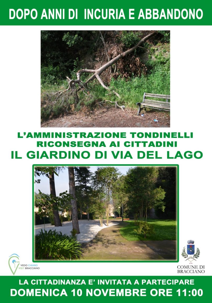 Sarà riconsegnato domenica 10 novembre ai cittadini e riaperto al pubblico, dopo quasi dieci anni di chiusura, lo splendido Giardino Comunale di via del Lago, ai piedi dell’imponente torre merlata di nordovest del Castello di Bracciano. La riconsegna ai cittadini di Bracciano, invitati a partecipare all’evento, avverrà alle ore 11:00 nel verde del Giardino Comunale strappato al degrado, riqualificato e tornato bene pubblico a disposizione della comunità.Il terreno su cui si estende il Giardino Comunale fu donato dalla famiglia Odescalchi al Comune di Bracciano che vi realizzò un’oasi verde di oltre 6mila metri quadri (0,6 ettari) nel centro storico della città. Inaugurato nel 2006, il Giardino fu successivamente abbandonato all’incuria e infine chiuso per ragioni di sicurezza.