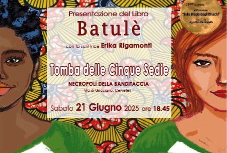 Sabato 21 giugno alle ore 18.45 presso la Tomba delle Cinque Sedie – area esterna della Necropoli della Banditaccia, verrà presentato il libro “Batulè” di Erika Rigamonti. Un nuovo appuntamento culturale ideato dall’attore – regista Agostino De Angelis con Desirèe Arlotta – Associazione ArchèoTheatron, in collaborazione con il GAR, sezione Cerveteri, Ladispoli, Tarquinia che ha in custodia il sito e promosso dalla Soprintendenza Archeologia Belle Arti e Paesaggio per la Provincia di Viterbo e l’Etruria Meridionale.