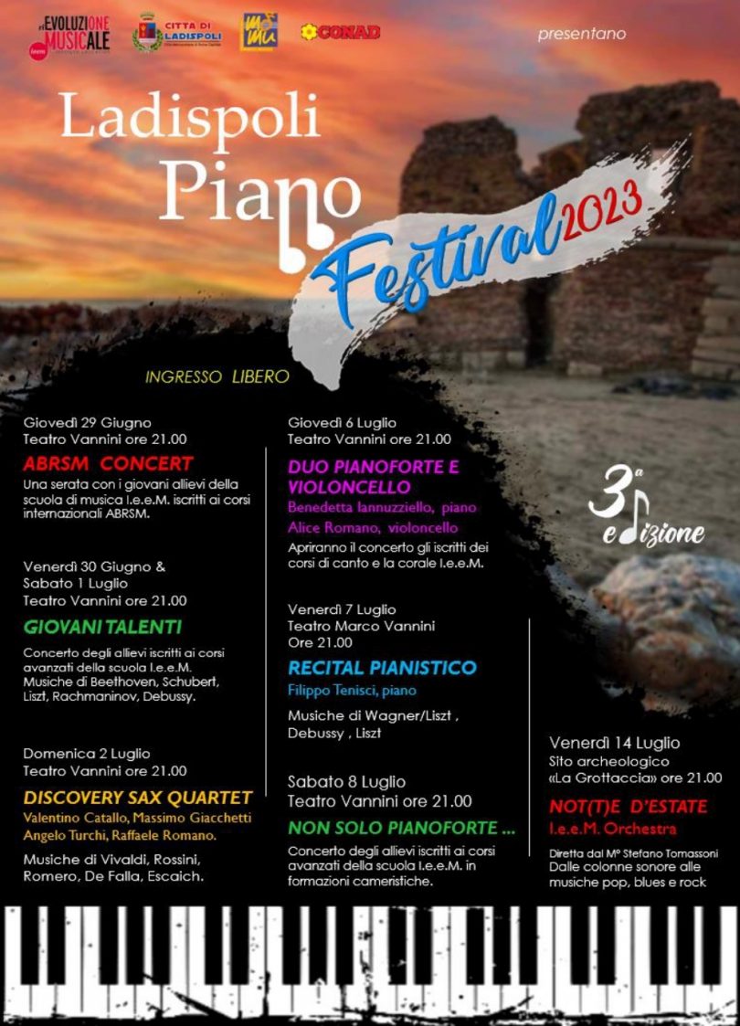 La manifestazione, ormai alla sua terza edizione, è tenuta viva dall’entusiasmo dei ragazzi che, protagonisti indiscussi del Festival, renderanno le serate dal 29 giugno all’8 luglio magiche all’interno del Teatro “Marco Vannini” di Ladispoli. Il cartellone, vario ed elaborato, vede l’alternarsi di grandi artisti del panorama italiano ai giovani talenti dell’“I.e.e.M.” Queste le parole del Diretttore artistico: “orgogliosi di aver donato alla nostra città e al panorama culturale e artistico ivi presente un Festival senza precedenti: nessuno aveva mai pensato ad una manifestazione musicale che mettesse al centro il pianoforte nelle sue molte forme, solistica, cameristica e d’accompagnamento al canto lirico. Siamo particolarmente felice di questa terza edizione e, in particolare, per come abbiamo allargato i nostri orizzonti con un cartellone a 360°, arrivando ad occupare ben 2 fine settimana per inserire tutti i concerti. Immutata e centrale è la missione del nostro Festival: avvicinare alla musica classica un pubblico giovane, coetaneo degli esecutori che, con entusiasmo e passioni, si esibiranno.” Il Festival si aprirà il 29 giugno con una serata dedicata ai ragazzi che hanno intrapreso i percorsi ABRSM, certificazioni internazionali riconosciute in tutto il mondo per ogni tipo di strumento; il 30 giugno e il 1 luglio sarà la volta dei ragazzi iscritti ai corsi avanzati della scuola di musica I.e.e.M. Il programma dei due concerti sarà talmente vario da accontentare qualsiasi tipo di pubblico: dalla cantabilità di Schubert al virtuosismo di Rachmaninov, dalla razionalità di Bach all’impeto di Beethoven. Il 2 luglio la scena sarà riservata al “Discovery Sax Quartet”, un quartetto di sassofonisti di altissimo livello che offrirà al pubblico presente un emozioni imperdibile: Grazie a un repertorio innovativo e originale i musicisti del quartetto, Massimo Giacchetti, Angelo Turchi, Raffaele Romano e Valentino Catallo, guideranno gli spettatori alla scoperta di generi variegati generi musicali: classico-moderno, tango, danze latino-popolari e ragtime contemporaneo. Dopo una piccola pausa di 3 giorni si riprenderà, il 6 luglio con la sonata n° 3 di Beethoven in La maggiore per violoncello e pianoforte, nell’interpretazione rispettiva di Alice Romano e Benedetta Iannuzziello. Il concerto sarà aperto dagli allievi di canto lirico con un repertorio che spazierà da Monteverdi a Haendel fino alle arie tratte dalle opere buffe di Mozart e dal corale femminile “I.e.e.M.” Il 7 Luglio è previsto il recital pianistico del talentuoso pianista Filippo Tenisci con un programma che metterà al centro il virtuosismo di Liszt con la trascrizione del Liebestod di Wagner accostato alle sonorità rarefatte di delle Images II Debussy, per poi riprendere nella seconda parte del concerto il Maestro di Lipsia con la sua Sonata in si minore. L’8 Luglio sarà la serata dedicata al pianoforte e alla musica da camera, con gli allievi della scuola di musica: il programma unirà alcuni tra i più grandi nomi della musica internazionale da Beethoven a Chopin fino a Piazzolla e Monti con la Czardas. Isituto educativo rievoluzione Musicale Il 14 Luglio si chiuderà la manifestazione con il concerto della “I.e.e.M. Orchestra” che presenterà al pubblico la propria “doppia anima” all’interno della magnifica cornice della “Grottaccia”: la prima parte sarà dedicata alle colonne sonore che hanno fatto la storia del cinema con Morricone e Williams e la seconda dedicata alle musiche pop rock e blues più famose, dai Blues Brothers ai Queen, dagli Europe a M. Bublè.