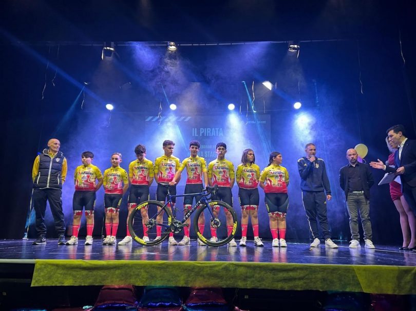 Aria di festa al teatro Gigi Proietti di Priverno per la presentazione della squadra ciclistica di Sezza, Il Pirata Vangi, che ha organizzato un evento in grande stile, come da tradizione fa alla viglia della partenza della stagione agonistica. Merito del presidente Andrea Campagnaro e del presidente onorario, l’imprenditore toscano Fabrizio Vangi che si occupa della formazione juniores, ai nastri di partenza una delle migliori nel panorama ciclistico italiano. Sul palco, oltre ai più grandi, anche le formazioni di esordienti, allievi e giovanissimi, in totale 60 atleti accompagnati da istruttori, direttori sportivi e dirigenti. Saluti degli assessori allo sport di Priverno , Pierluigi Vellucci, e dell’omonimo di Sezze, Michela Capuccili, che si sono congratulati con il Team il Pirata per il grande lavoro svolto negli anni nella provincia di Latina. Annunciata una grade novità, è nata la collaborazione con la società araba UAE per quanto riguarda il settore giovanile. ” Siamo molto contenti di quello che faremo, partiamo con gli stessi presupposti degli anni passati, speriamo di fare del nostro meglio e portare entusiasmo nei bambini e ragazzi – ha detto Andrea Campagnaro”