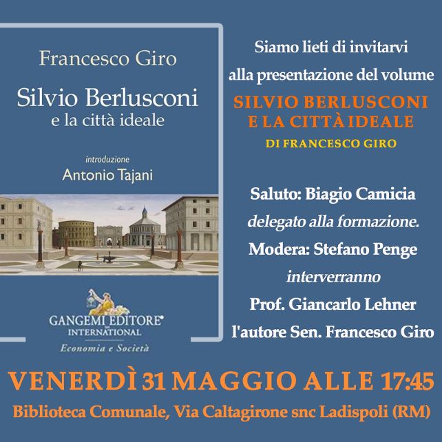 Presso la Biblioteca venerdì 31 maggio alle ore 17:45 si terrà la presentazione del nuovo libro di Francesco Giro. Berlusconi e la città ideale. Un libro che parla di libertà, ideali, umanesimo, rinascimento, filosofia e architettura. Alla presentazione ci sarà il Saluto di Biagio Camicia delegato alla formazione. Il moderatore è organizzatore sarà Stefano Penge, interverranno il Prof. Giancarlo Lehner e l’autore Sen. Francesco Giro. L’evento si terrà nella Sala Conferenze della Biblioteca comunale di Ladispoli. Alla fine dell’evento l’autore si I tratterà con i presenti per rispondere ad eventuali domande. La partecipazione è libera e gratuita e non è richiesta prenotazione.