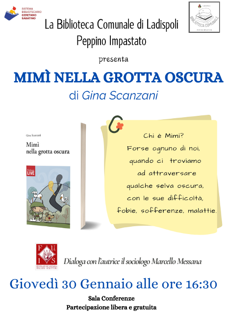L’amministrazione comunale informa che giovedì 30 Gennaio, alle ore 16:30, la Biblioteca ospiterà la presentazione del libro dal titolo: “Mimì nella grotta oscura” di Gina Scanzani: una delicata opera che è un viaggio introspettivo ispirato dall’esperienza reale dell’autrice.Gina Scanzani  attraverso una storia semplice e coinvolgente rende comprensibile il complesso tema dell’accettazione di una malattia. Mimì è un personaggio alla ricerca di se stesso, con cui molti lettori potranno identificarsi: ci insegna come di fronte alle sfide più grandi possiamo trovare la forza di andare avanti, ci mostra come spesso non abbiamo bisogno di grandi parole per affrontare le difficoltà e, a volte, una semplice storia può bastare per darci la forza di superare i nostri limiti e trovare la felicità.Il libro, edito da Centro Studi Erickson, è dedicato a tutti coloro che cercano un punto di riferimento, una guida per affrontare le sfide della vita.Gina Scanzani, da sempre poetessa e appassionata di poesia, che considera valvola di sfogo e chiave di lettura per l’animo, pubblica il suo primo libro nel 2013 e con  la favola di Mimì è stata classificata al Premio Mondiale Golden Aster Book 2020 e vincitrice del XII Premio Internazionale Navarro 2021.  La presentazione si terrà nella Sala Conferenze della Biblioteca e dialogherà con l’autrice il sociologo Marcello Messana.Prima e dopo la presentazione, l’autrice si intratterrà con il pubblico per rispondere alle curiosità e per il rituale firmacopie.La partecipazione è libera e gratuita e non è richiesta prenotazione.