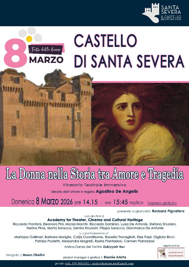 L’Associazione Culturale ArchéoTheatron presenta, in occasione della Festa della Donna, un Itinerario Teatrale Immersivo dal titolo “La Donna nella Storia tra Amore e Tragedia”, ideata e diretta dall’attore e regista Agostino De Angelis. L’evento si terrà domenica 8 marzo 2026 presso il Borgo e Castello di Santa Severa, con primo appuntamento alle ore 14.15 e replica alle ore 15.45. L’ingresso è gratuito.