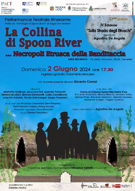 Domenica 2 Giugno 2024 alle ore 17.30 all’interno dell’area recintata della Necropoli Etrusca della Banditaccia di Cerveteri sarà realizzata dall’associazione culturale ArchéoTheatron e dall’attore e regista Agostino De Angelis e promossa dal PACT Parco Archeologico di Cerveteri-Tarquinia, la Performance Teatrale Itinerante “LA COLLINA DI SPOON RIVER…NECROPOLI ETRUSCA DELLA BANDITACCIA” tratta da “Antologia di Spoon River” di Edgar Lee Masters con il patrocinio del Comune di Cerveteri, Regione Lazio e Città Metropolitana di Roma Capitale.