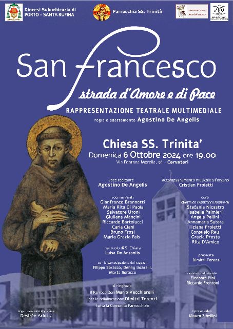 La Parrocchia della SS. Trinità di Cerveteri domenica 6 ottobre alle ore 19:00 dedicherà una rappresentazione religiosa al Santo Patrono d’Italia, San Francesco d’Assisi, in occasione delle celebrazioni a lui dedicate, con una rappresentazione teatrale multimediale per la regia e adattamento di Agostino De Angelis, dal titolo “San Francesco, strada d’Amore e di Pace”.