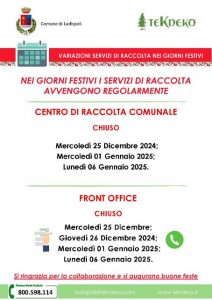 L’Amministrazione comunale di Ladispoli rende noto che in occasione delle festività natalizie il servizio di raccolta porta a porta mercoledì 25 e giovedì 26 dicembre 2024 e mercoledì 1 e lunedì 6 gennaio 2025 avverrà regolarmente. Il Centro di raccolta comunale sarà chiuso mercoledì 25 dicembre, mercoledì 1 gennaio e lunedì 6 gennaio. Il front office sarà chiuso il 25 e 26 dicembre, 1 e 6 gennaio.