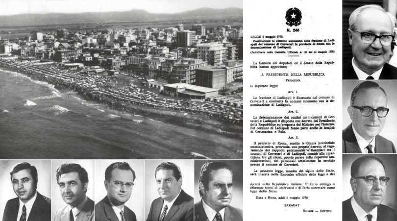 Mercoledì 6 maggio 1970: con Legge n. 240 è costituito il Comune autonomo di Ladispoli. L’Atto è proposto dai parlamentari Carlo Felici, Bartolomeo Ciccardini, Attilio Iozzelli, Ennio Palmitessa, Marcello Simonacci. Approvato secondo iter legislativo, il documento normativo sarà poi promulgato a firma di Giuseppe Saragat, Presidente della Repubblica, Mariano Rumor, Presidente del Consiglio dei Ministri e Franco Restivo, Ministro dell’Interno. Da allora l’inizio di un cammino, partito da agglomerato urbano e diretto all’obiettivo di divenire città. Il Comune autonomo di Ladispoli compie oggi 54 anni: auguri!