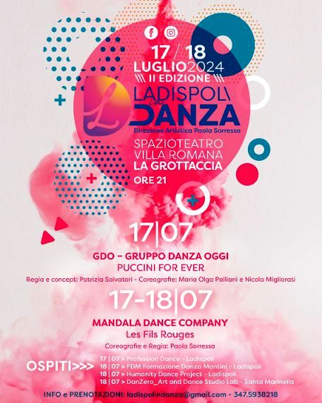 Un programma ricco di eventi che verrà inaugurato il 17 Luglio dalla compagnia GDO – Gruppo Danza Oggi in scena con Puccini For Ever, una rivisitazione delle melodie pucciniane in un linguaggio contemporaneo trasversale che incrocia 4 artisti che hanno in comune la regione di origine: l’Umbria. Il lavoro è prodotto da GDO danzano: Maria Olga Palliani, Nicola Migliorati, Beatrice Ieni e Riccardo Berretta, artisti associati del Gruppo Danza Oggi. Regia e concept di Patrizia Salvatori, con le coreografie di Maria Olga Palliani e Nicola Migliorati. Il 17 e il 18 luglio vedrà protagonista Mandala Dance Company in Les Fils Rouges, coreografie e regia di Paola Sorressa. Con un incipit dedicato alla dichiarazione universale dei diritti umani, Les Fils Rouges è una produzione site specific che si ispira alle diverse interpretazioni dei leitmotiv che ci conducono in questa vita. In alcuni momenti rappresentano quello che ci lega, in altri quello che ci separa; possono indicarci una direzione o impedirci di raggiungerla. Per Freud il filo rosso è quell’elemento preciso dell’inconscio che definisce l’intero percorso psicologico di un individuo. Una leggenda cinese particolarmente diffusa anche in Giappone ci vede fin dalla nascita con un filo rosso annodato al mignolo della mano sinistra. Con questo filo invisibile, lunghissimo e indistruttibile siamo legati alla nostra anima gemella alla quale siamo destinati prima o poi a unirci. Questa edizione di Ladispoli in Danza ospiterà ogni sera performance che vedranno in scena allievi della scuola di Danza più longeva di Ladispoli Profession Dance con la direzione didattica di Marta Scarsella e la direzione artistica di Paola Sorressa, che quest’anno festeggia i suoi 30 anni di attività, specializzata nella danza classica e nel contemporaneo (17 luglio). Il 18 Luglio saranno invece protagoniste altre due le scuole di Ladispoli: FDM Formazione Danza Mantini diretta da Loredana Mantini, specializzata nel Modern e Humanity Dance Project diretto da Daniele Ingrassia, specializzato nella danza hip hop, accanto a DanZero_Art and Dance Studio Lab di Santa Marinella diretta da Tiziana Orsomando, specializzata in danza classica e contemporanea. La rassegna è organizzata da Mandala Dance Company, con il patrocinio del Comune di Ladispoli.