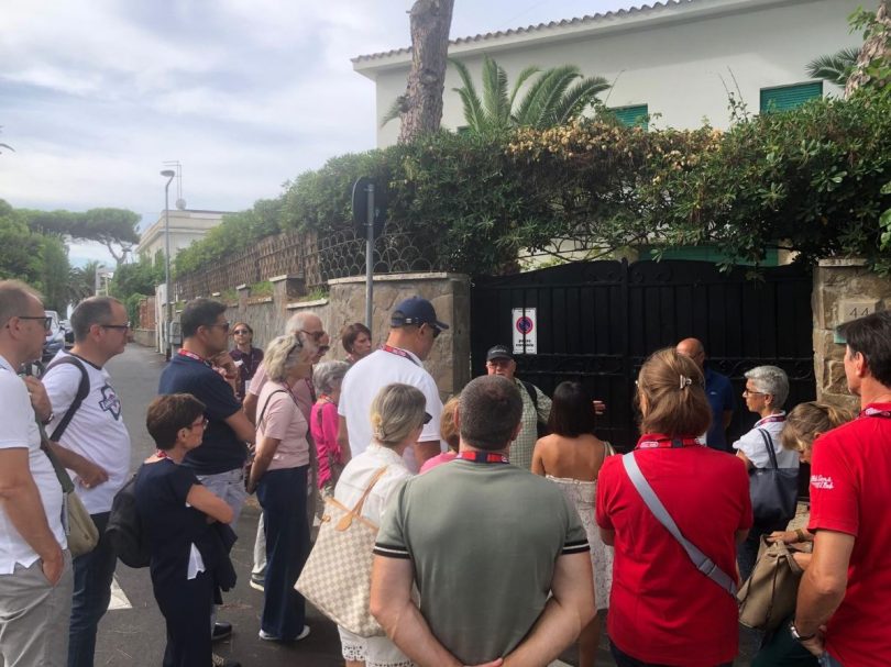 Nel dopoguerra Santa Marinella, grazie al gradevole microclima, le spiagge, i locali e non ultima la vicinanza a Roma, divenne punto d’interesse di svariati personaggi del cinema, artisti, scrittori, protagonisti della politica e del jet-set internazionale; è l’Hotel Le Palme, del Sor Cesare Grimaldi, a conservare una pagina di storia del Re Faruk e la Regina Narriman d’Egitto; Fiorella Grimaldi, padrona di casa dell’Hotel Le Najadi, proprietaria storica del celebre edificio arroccato sulla costa di Santa Marinella, ha accolto il gruppo per una breve sosta, un piccolo rinfresco, raccontando con entusiasmo le conoscenze di un’epoca d’oro di cui la Città fu brillante protagonista: “Conobbi Giorgio Bassani da bambina. Qui nei galà del fine settimana si ritrovavano artisti del calibro di Roberto Rossellini e Ingrid Bergman, Gregory Peck, De Sica, Alberto Sordi, Mario Soldati con la sua famiglia. Giorgio Bassani, in particolare, divenne ospite abituale. Ammaliato dal mare, dalla natura, dalla salubrità del posto, trovò ispirazione per redarre il suo capolavoro, “Il Giardino Dei Finzi-Contini; trascorse, solo, l’invernata 1962/63 a Santa Marinella, lavorando alla stesura del libro, cui dedicò la prima pagina. Proseguendo su Lungomare Marconi, la Villa di Mons. De Bisogno, Cameriere di Pio IX, vicino di casa e amico della Famiglia Pacelli, proprietari della Villa alle spalle, dall’inconfondibile color bordeaux. Eugenio Pacelli, futuro Papa Pio XII, vi trascorreva le vacanze con la famiglia, in uno dei punti ritenuti migliori per salubrità dell’aria; da Cardinale qui conobbe le famiglie nobiliari Bezzi-Scali e Sacchetti e nacque una profonda amicizia con il Premio Nobel Marconi: quest’ultimo promise di costruire e donare al Papa una stazione Radio (l’odierna Radio Vaticana). Ultima tappa dell’itinerario, Villa Jolanda di Savoia, del Re D’Italia Vittorio Emanuele III; quest’ultimo, su consiglio del Prof. Francesco Valagussa, medico di corte e primario del Bambin Gesù, edificò nelle immediate vicinanze della villa dei Pacelli, una dimora per sua figlia Jolanda, trasferitasi in città per guarire da una malattia polmonare. Le prime stesure dei Patti Lateranensi videro l’alba a Santa Marinella, tra i due “eccellenti” vicini di casa, Il Re D’Italia ed Eugenio Pacelli; nella stesura definitiva del Concordato, il Re Vittorio Emanuele III cedette la sua villa di Santa Marinella all’Ospedale del Bambin Gesù.