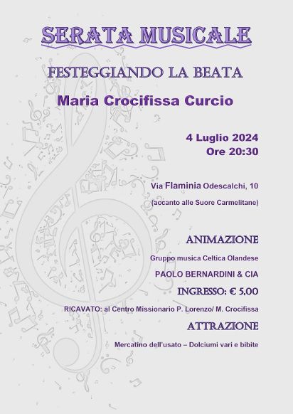 Giovedì 4 luglio, in occasione del dies natalis della Beata Madre Crocifissa, le Suore Carmelitane Missionarie di Santa Teresa del Bambino Gesù hanno organizzato una serata di beneficenza, per le ore 20,30,  euna serie di celebrazioni religiose. Come è noto, Madre Crocifissa ha legato fortemente il suo nome alla città di Santa Marinella. Venuta a Roma, il 18 maggio 1925 accompagnata da Padre Lorenzovan den Eerenbeemt, visita Santa Marinellae rimane profondamente colpita dalla bellezza naturale di questa zona, ma anche dall’estrema povertà della gran parte dei suoi abitanti e qui comprende di essere finalmente giunta “all’approdo”. Ottenuto un permesso,richiesto dallo stesso Padre Lorenzo, ad esperimento dal vescovo della diocesi di Porto S. Rufina, il 3 luglio 1925 si stabilisce definitivamente a Santa Marinella e il successivo 16 luglio, il nascente Istituto riceve il decreto di affiliazione della piccola comunità all’Ordine Carmelitano, sigillando così per sempre la sua appartenenza a Maria nel Carmelo.Per ricordare la Madre quindi le Suore Carmelitane Missionarie di Santa Teresa del Bambino Gesù hanno voluto organizzare, con l’aiuto dei volontari, anche una serata di beneficenza finalizzata alla raccolta di fondi per il restauro di una villa che le Suore Carmelitane Missionarie hanno ricevuto in donazione e che intendono mettere a disposizione, per una serie di attività, a favore della cittadinanza e soprattutto dei giovani. La vera risorsa della villa è infatti il grande giardino che potrebbe essere destinato ad un campo sportivo polivalente e uno spazio coperto per musica, incontri e anche feste. Per questo i Volontari e le Suore Carmelitane Missionarie di Santa Teresa del Bambino Gesù hanno voluto organizzare questa serata aperta alla cittadinanza, un momento di socialità e di condivisione ad un costo contenuto, 5.00 € a persona.Quindi dalle ore 20:30 in Via Flaminia Odescalchi, 10 (accanto alle Suore Carmelitane) si svolgerà una serata con animazione Musica Celtica Irlandese a cura del Gruppo “I GROOT”Mercatino dell’usato e degustazione di dolciumi vari e bibite. Tutta la cittadinanza è invitata a partecipare.
