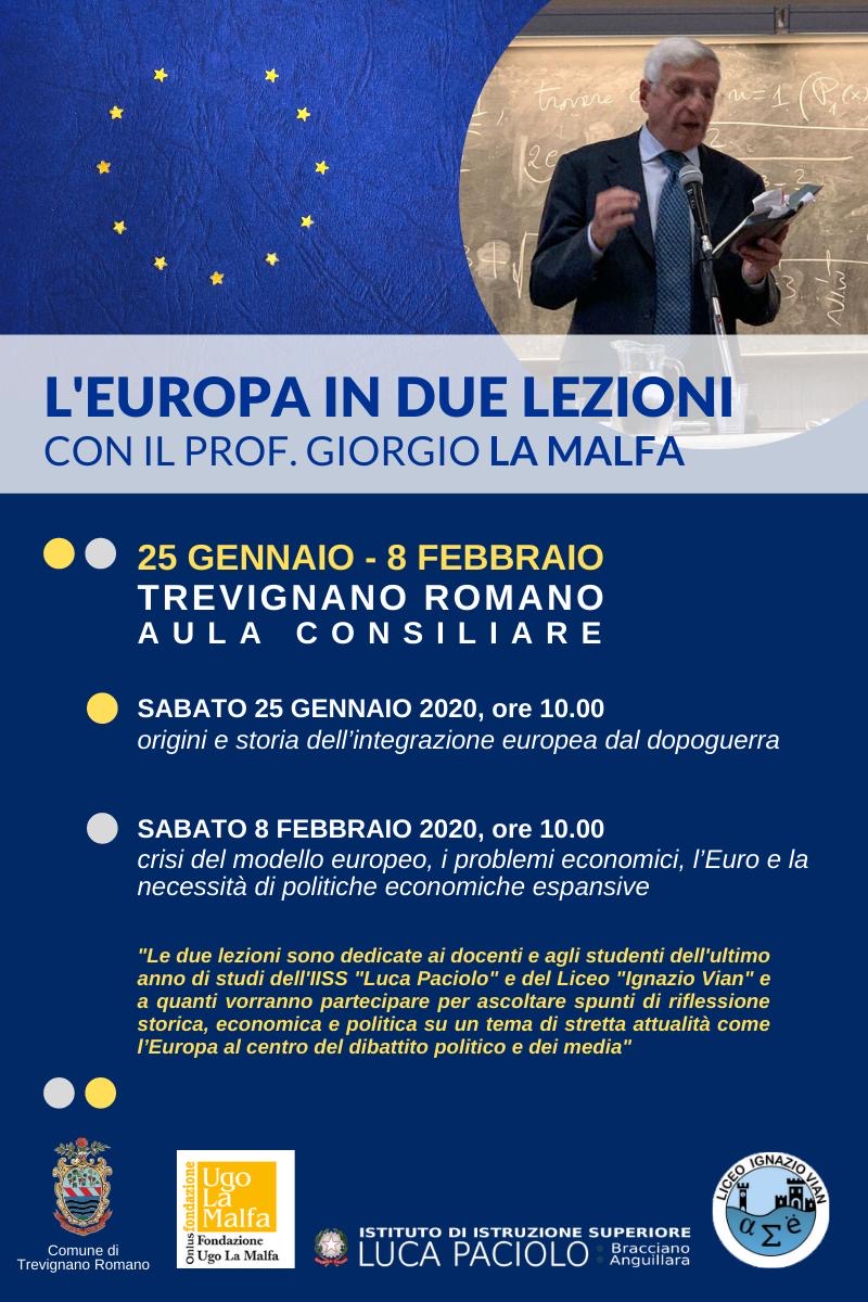 L’Europa in due lezioni, a Trevignano il Professore Giorgio La Malfa terrà due lezioni rivolte ai maturandi del Liceo Vian e del Paciolo.Si terranno sabato 25 gennaio e sabato 8 febbraio 2020, presso l’Aula Consiliare del Comune di Trevignano Romano, due lezioni sull’Europa che avranno come docente l’On. Prof. Giorgio La Malfa e come discenti i maturandi del Liceo Vian e dell’ISS Paciolo di Bracciano e verteranno, la prima lezione, sulle origini dell’Unione Europa e la seconda sull’euro e sull’attuale crisi del disegno europeista. Le due lezioni saranno aperte alla partecipazione dei cittadini e di quanti riterranno interessante partecipare anche al dibattito che seguirà ogni singola lezione.
