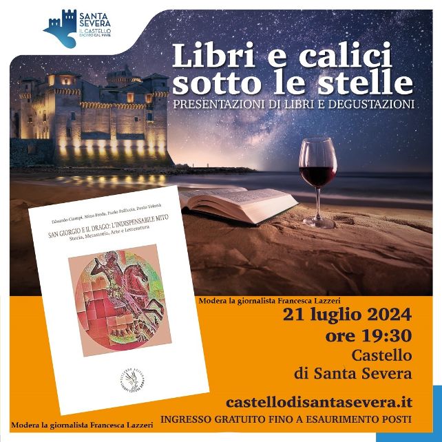 Domenica 21 luglio, alle ore 19.30 presentazione del saggio “San Giorgio e il drago: l’indispensabile mito. Storia, metastoria, Arte e Letteratura” degli autori Eduardo Ciampi, Mino Freda, Paolo Palliccia, Paolo Velonà.La presentazione in Sala Nostromo con ingresso gratuito è moderata dalla giornalista Francesca Lazzeri e i partecipanti potranno degustare calici di vino dei produttori del territorio associati alla Strada del vino delle terre etrusco romane. Un saggio che tende a far chiarezza sul mito di San Giorgio, figura assai diffusa nelle tradizioni popolari, ma le cui radici sono poco conosciute, la sua leggenda è stata una delle più diffuse per tutto il medioevo, e oltre, dominando nei secoli l’immaginario collettivo con la sua immediata e potente carica simbolica. Attraverso la storia, le arti e la letteratura creativa, gli autori delineano un quadro stimolante di questo indispensabile mito che fa riferimento a un santo piuttosto enigmatico. La leggenda narra che Giorgio fosse un nobile cavaliere errante, originario della Cappadocia (nell’attuale Turchia), di fede cristiana. Apostolo su un bianco cavallo, giunse un giorno nel regno di Silene, in Cirenaica, che era funestato dalla presenza di un terribile drago, la cui forza distruttrice poteva essere contenuta solo da sacrifici umani. Fu proprio il “soldato di Cristo” a salvare dalle fauci del mostro la figlia del re, e come ricompensa non volle né onori né denari, ma che tutto il popolo si convertisse ricevendo il battesimo.