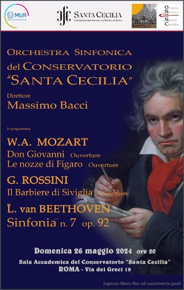 Alle ore 20 di domenica 26 maggio 2024, nella prestigiosa Sala Accademica del Conservatorio “Santa Cecilia” di Roma, in Via dei Greci 18, il M° Massimo Bacci, già direttore dell’Orchestra giovanile Massimo Freccia di Ladispoli, dirigerà il debutto della neocostituita OSCSC, Orchestra Sinfonica del Conservatorio Santa Cecilia. In programma due tra le più celebri Ouverture di W.A. Mozart, il Don Giovanni e Le nozze di Figaro, oltre al Barbiere di Siviglia di G. Rossini; infine la meravigliosa Settima Sinfonia di L. van Beethoven. Davvero un evento da non perdere! L’Istituzione ha concesso l’ingresso gratuito fino ad esaurimento posti.