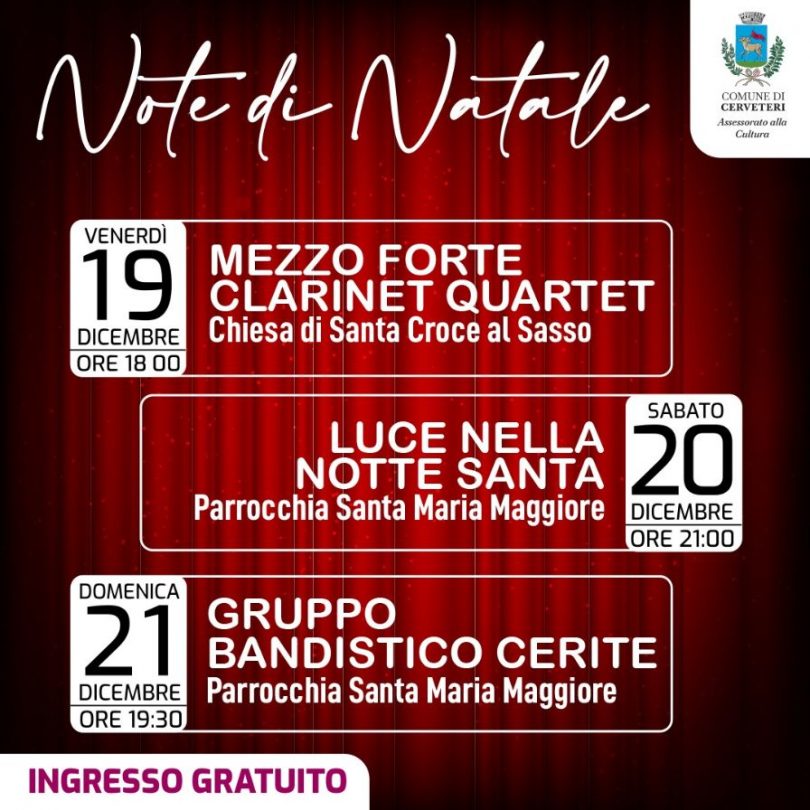 “Un finesettimana all’insegna della tradizione a Cerveteri – ha dichiarato Francesca Cennerilli, Assessore alla Cultura del Comune di Cerveteri – una serie di appuntamenti tutti ad ingresso gratuito ai quali sono certa gli appassionati di musica non mancheranno. Il programma del Natale Caerite proseguirà chiaramente per tutte le feste, con tanti eventi ad ingresso gratuito, tra musica da camera e il grande gospel”.