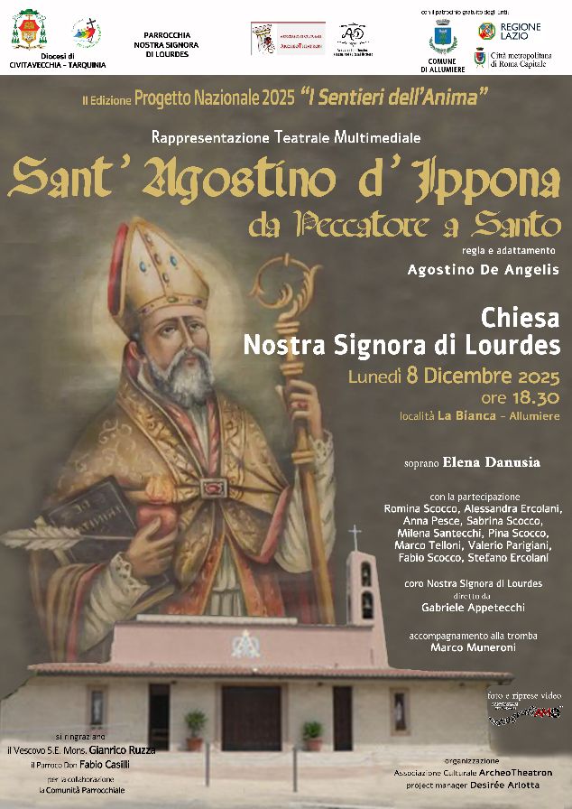 Dopo il successo riscosso lo scorso agosto presso l’Eremo della SS. Trinità di Allumiere, torna in scena la Rappresentazione Teatrale Multimediale dedicata a Sant’Agostino d’Ippona, con la regia di Agostino De Angelis, in una nuova e suggestiva cornice. L’appuntamento “Sant’Agostino d’Ippona: da Peccatore a Santo” è fissato per l’8 dicembre 2025 alle ore 18.30 nella Chiesa Nostra Signora di Lourdes nella località La Bianca del Comune di Allumiere, un luogo che, con la sua spiritualità, si presta alla narrazione intensa e contemplativa della vita del grande Dottore della Chiesa.